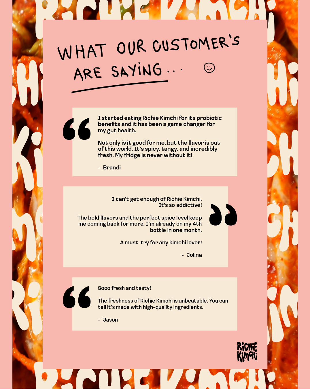By choosing Richie Kimchi, you’re not only supporting a small business, but also joining us in our journey to make kimchi a staple in households everywhere. We’re on a mission to break barriers and share the incredible benefits of kimchi. We believe that kimchi shouldn’t be confined to any one culture or cuisine – it belongs in every kitchen!